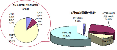從圖可發(fā)現(xiàn),實體網(wǎng)點1千多家,3月份獲得酬金的只有465家,未獲積分酬金的網(wǎng)點數(shù)量不少。在有積分酬金的網(wǎng)點中,約70%的網(wǎng)點增值業(yè)務(wù)傭金低于平均水平163元。而酬金獲取多的主要集中在少數(shù)幾個網(wǎng)點。表明:增值業(yè)務(wù)開展量主要集中在少數(shù)網(wǎng)點,遠未形成渠道的整體能力。